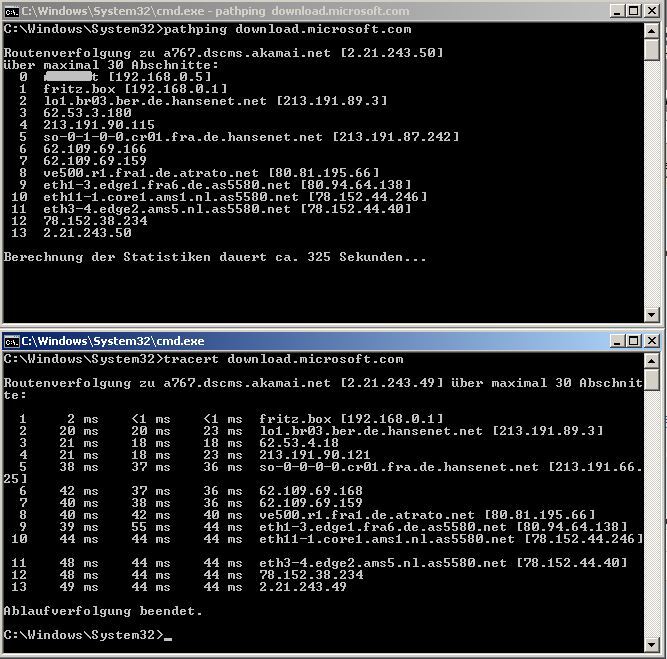 hier ein screenshot des pathping und einer tracert zu download.microsoft.com