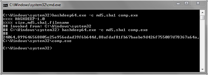 ## C:\Windows\System32> hashdeep -c md5,sha1 .\comp.exe