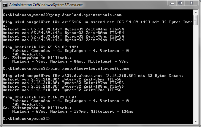 Ping der Seiten download.sysinternals.com und xpsp.dlservice.microsoft.com