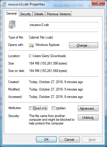 Tue 10/25/2016 23:46:53.92 - Warning: Deleted unsigned file "C:\Users\Tonsils\Desktop\wsusoffline\client\wsus\wsusscn2.cab"