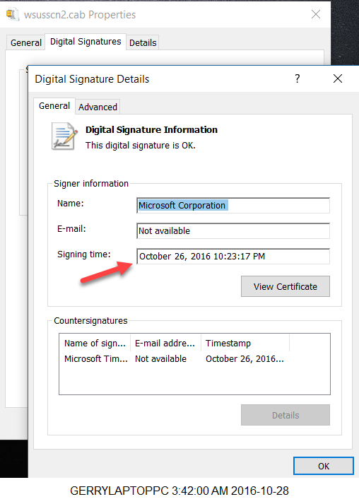 The wsusscn2.cab that was downloaded last evening contains the Digital Signatures tab that you were asking me to use. Screen image attached for this new file.