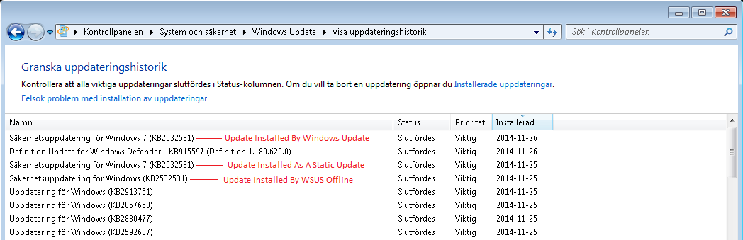 I am trying to install updates on a Windows 7 Professional 32-bit machine (Swedish Edition), after running the installer everything appears to have worked correctly, however if I run it again it repeatedly tries to install update KB2532531 and fails due to error code 2359302 (Update already installed). If I look at the update history it is shown as installed called "Säkerhetsuppdatering för Windows (KB2532531)", It is also displayed in the list generated when running "ListInstalledUpdateIds". However when running the Microsoft Baseline Security Analyzer it says the update is missing. I have tried adding this update as a static update, when this static update is installed it is shown in the update history as "Säkerhetsuppdatering för Windows 7 (KB2532531)" (The same as before, but states "Windows 7", rather than just "Windows") Still MBSA says the update is missing, If I install this update using regular Windows Update, the update is installed as "Säkerhetsuppdatering för Windows 7 (KB2532531)" and MBSA recognizes it is installed.