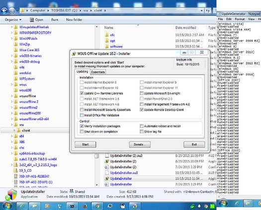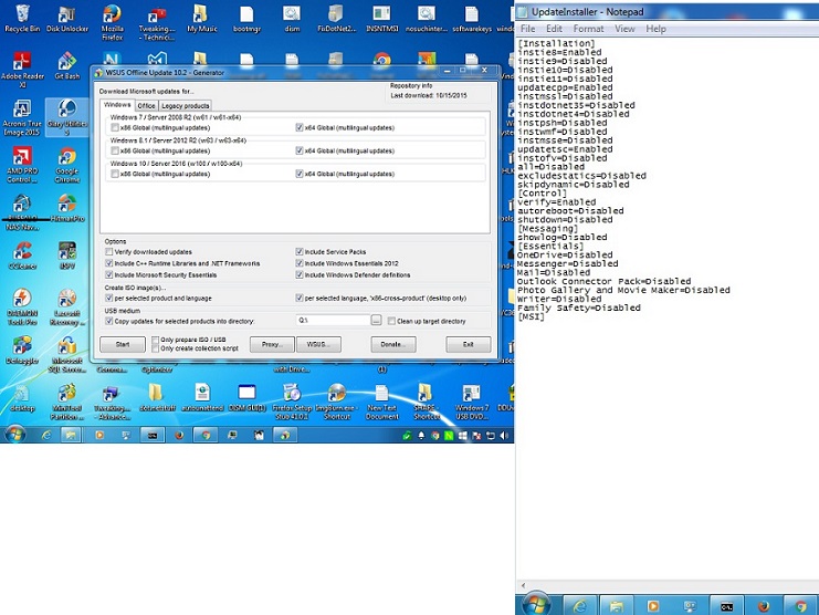 For additional clarification this is occurring after downloading the WSUSoffline10.1.zip file and then extracting to my update directory. In my case it is "c:\wu\wsusoffline". The error occurs usually when launching the Updategenerator.exe. there is not usually an.ini file showing until after I run the Updategenerator.exe at least once. I have been checking the .ini file when it does appear and I have noticed that regardless of my selections in the UpdateGenerator.exe menu, the .ini file will show most (if not all) options as "Disabled". Typically I only need the x64 versions and do not need the Office options. I do have a key for Office 2016 but I have not installed it yet. Before in previous versions of WSUSoffline I was downloading the updates for mulitple other OS (XP-64, Vista, Win 7, Win 8.1, and now Win 10 also) as I still have old OS that are on other disks/computers that i may try to update and keep running for as long as I can. I would typically just burn to DVD and then install from there on the individual OS's/machines with DVD. Now I cannot even get any of my OS to get the initial download of the updates because of the "medium neither supports your Windows or Office version" error on attempt to download. I have tried to manually replace "Disabled" with "Enabled" in the .ini file and it did seem to work a couple of times and I let it download the updates for about 6 hours or so. In that case once I had the updates I went to the client folder and tried to install them with the UpdateInstaller.exe and then getting the same "medium neither supports your Windows or Office version". I tried to do both options for the ISO files (I think I did end up with both the x86 and x64 versions) yet the error remains. Error is the same when try to install the downloaded options to another OS. Example: ON the Windows 10 tried both the normal way: download and then install by extracting the initial zip file to a clean update dir, then running the update generator but immediately get the "not supported" error. So then tried to just install a previously downloaded update file x64, but same exact error. In most cases, even if I try to manually change the .ini files to "Enabled" and then save it, as soon as I open it again it's back to mostly or completely being "Disabled". So I'm at a total loss....Of note I did try to download an earlier version of WSUS offline, (one of the 8.1 versions I think) and was able to get it to download and install the updates on my Windows 7 machine, but it does not support the Windows 10, so that is not working there. I don't think this or any previous version have worked for me on Windows 10. What could be causing all these issue? I was already a little skeptical because even in prior versions of this file I didnt think that is was applying the updates as it stated. So despite it saying it had downloaded and installed .net or essentials, I'd reboot and then check and some or many updates would be missing and not installed. Don't have any 3rd party anti-virus runnning and I've tinkered with turning off firewall and Windows update (which cant really be turned off totally in Win 10) with various levels of success but never total success in getting it to install correctly. Thanks...