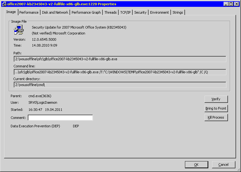 Stuck process runs 1st on install stage, and this update is in UpdatesToInstall.txt list. However I did neither specify switches to install office updates nor got MS Office 2007.
