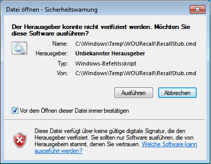 Bitte mal überprüfen, ob RecallStub.cmd einen "Zone Identifier" hat. Datei->Eigenschaften->Allgemein zeigt das ganz unten durch den Text "Sicherheit ... [Zulassen]" an. Das Progamm ...\bin\streams.exe kann den Alternativen Datenstrom entfernen.