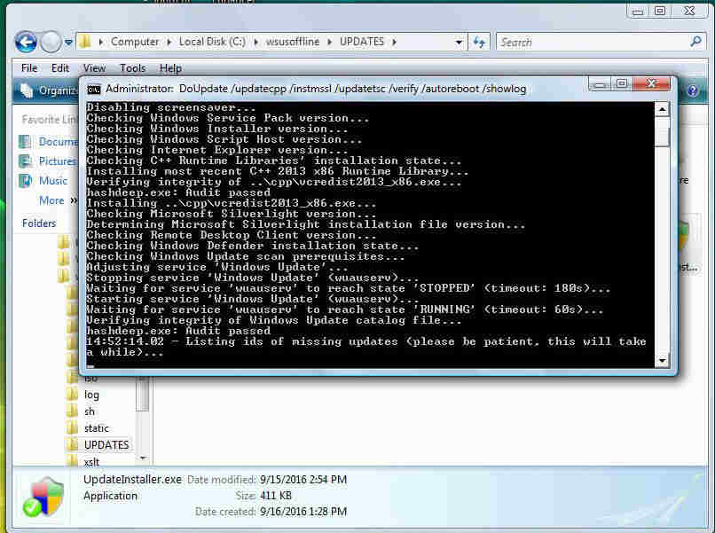 I had already run the program to get all the updates so I didn't repeat downloading them. I ran the update installer program and it got past the listing ids of missing updates problem in a minute or so. The machines now are installing the downloaded updates.