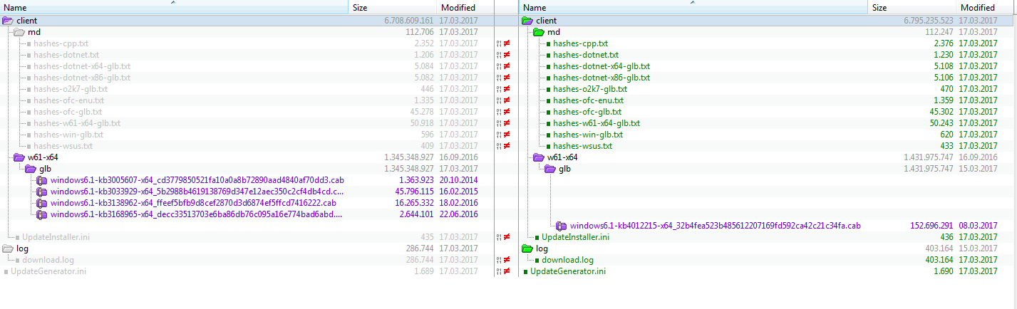Wie zu sehen gibt es im ersten Verzeichnisbaum (links) 4 Security Download-Packages während im zweiten (rechts) genau 1 Rollup Paket mehr ist.