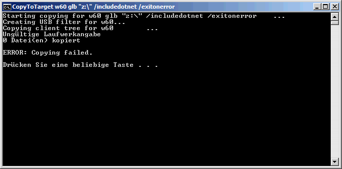 Das erscheint mir wenig missverständlich, und dass der "UpdateGenerator" nach einem Fehler von "CopyToTarget.cmd" nicht versucht, die Updates für die nächste Plattform auf das den Fehler verursachende Laufwerk zu kopieren, finde ich nur folgerichtig.