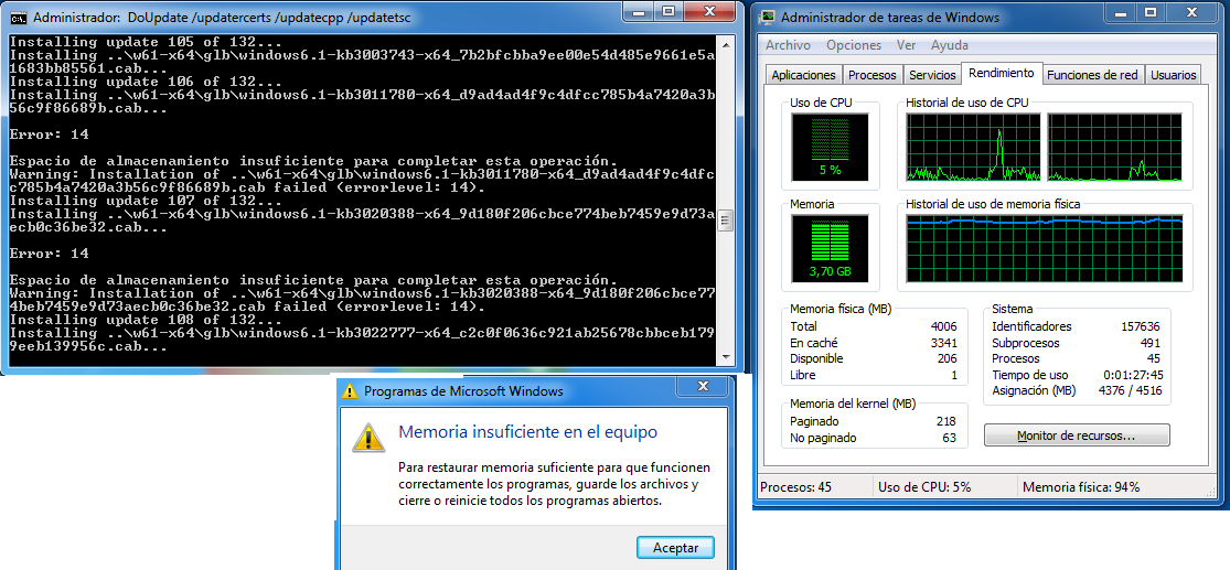 As you can see, by the time the update is going on the update number 106 (on a fresh Windows 7 installation) it runs out of memory and subsequent patches fail.