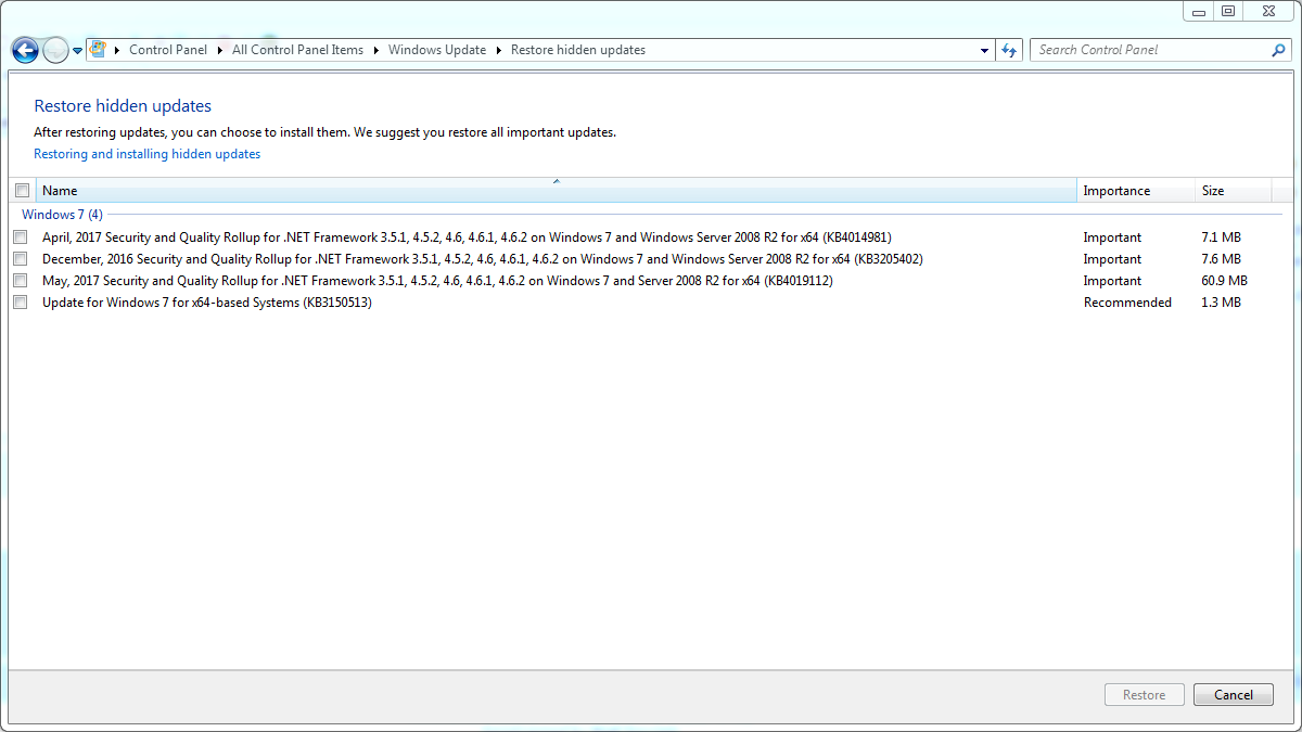 If you hide this month's Security and Quality Rollup, the previous month's will show up. Hide that, and the month's before appear. And so on. That's how supersedence of cumulative updates works in Microsoft land. There's a similar show with Silverlight updates.